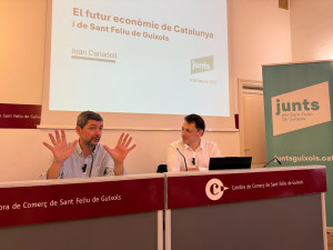Aforament complet a la Cambra de Comerç de Sant Feliu de Guíxols, que ha acollit aquesta tarda un debat-col·loqui organitzat per Junts per Catalunya - Sant Feliu de Guíxols, amb la participació destacada de Joan Canadell i Toni Carrión.